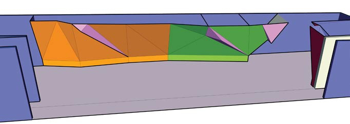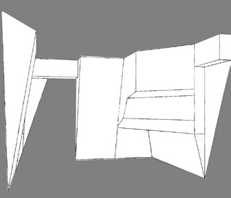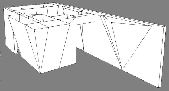 Le pan fait alors dans les 200 m2 de surface grimpable. Luc B. exécute alors un travail remarquable de modélisation sur ordinateur et nous propose différentes vues du projet. On rediscute encore et encore de tel ou tel forme de tel ou tel volume et au bout de 853 échanges de mails et autres soirées de discussion entre deux voies, on arrive à tomber d’accord sur un dessin définitif. Voilà donc à quoi ressemble le projet fin mai début juin 2004