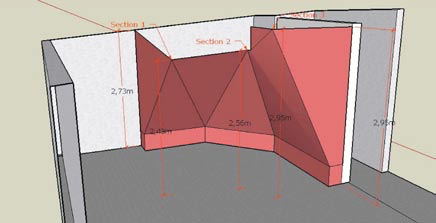 Nous prenons les côtes de la salle, commençons à réfléchir aux différents volumes souhaités, en fonction de leur intérêt pour la pratique de l’escalade, mais aussi de leur accessibilité à tous publics. Afin de bien nous rendre compte de ce que l’on imagine, nous tendons des ficelles un peu partout, simulant les différents profils…
