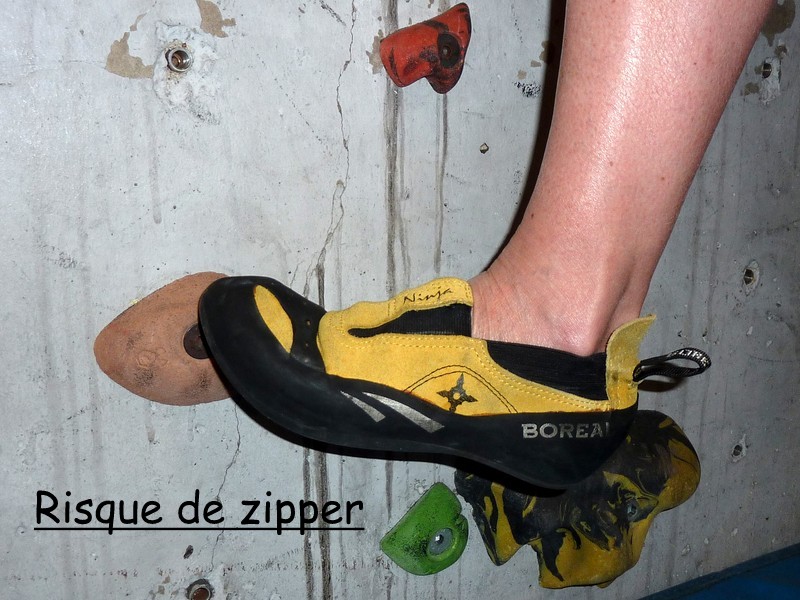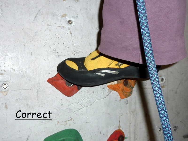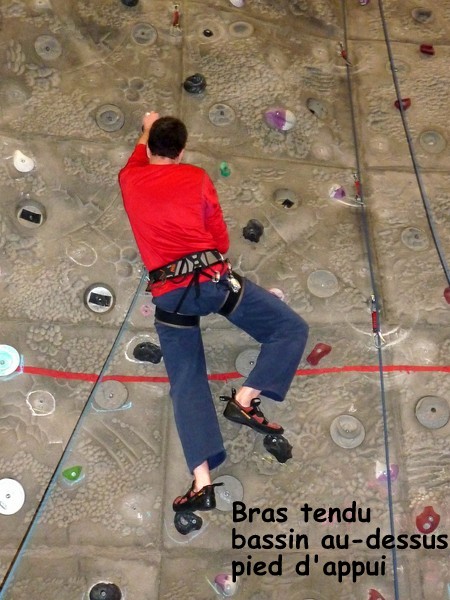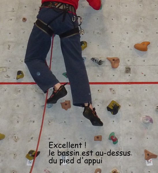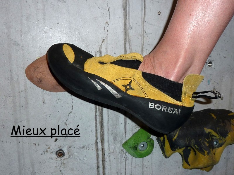 Pour acquérir cette adhérence tant convoité, il faut savoir que plus vous mettrez de poids au niveau du pied sur lequel vous devrez pousser, plus vous aurez de chance qu’il tienne en place sur la prise. Un débutant mettra bien son chausson sur la prise, mais ne transférera pas son poids dessus et , au moment de la poussée, il fera connaissance avec Monsieur Zip… Il faut donc venir « s’asseoir » sur ce pied, en y transférant le poids du corps, tout en gardant le talon bien bas, pour une adhérence optimale avant de pousser dessus. Entraînez vous à travailler cette sensation et petit à petit travaillez sur des prises de pieds de plus en plus excentrées de l’axe de votre grimpe, en effectuant un mouvement de votre corps avec la ferme intention d’amener votre bassin au-dessus de la prise de pied .