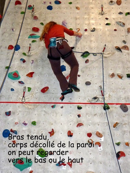 Quelle que soit l’inclinaison, le débutant sera collé contre le support proposé en essayant de tracter sur toutes les prises qu’il pourra atteindre au plus proche et rapidement il « éclatera » ses 2 biceps. Le confirmé sera le plus souvent en extension totale de la main à l’épaule. C’est beaucoup moins fatigant, on y gagne en efficacité et on économise ses forces, en plus ce détachement par rapport au support permet d’analyser au plus juste les mouvements à venir aussi bien vers le haut pour voir ce qui nous attend que vers le bas pour savoir où poser les pieds. Pour vérifier que vous êtes bien en extension du bras, il suffit d’observer le moment où votre main sera au plus loin de votre épaule: entraînez vous à prendre une prise le plus haut possible, verrouillez les doigts et la main dessus, suspendez vous sur votre épaule, ça tient, vous avez tout le temps de déplacer l’autre main ou vos pieds.
