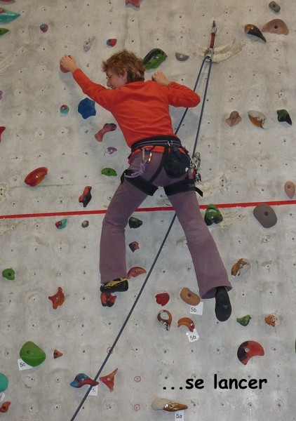Une fois la barrière psychologique franchie: de dépasser les 2,50 m de verticalité, de s’asseoir dans le baudrier pour redescendre, de la confiance dans le matériel, les manips de cordes et votre binôme, il faut franchir celle du vol. Plusieurs solutions s’offrent à vous: premièrement, attendre le jour où ça vous arrive sans le vouloir! Deuxièmement, provoquer la chute, ce qui permet de franchir le cap plus rapidement, au début entraînez vous dans des voies déversantes, pour vous apprendre à bien tomber et prendre confiance, car tout cela n’a qu’un seul but: vous permettre d’oser engager un mouvement avec un risque de chute… c’est la meilleure façon de progresser !