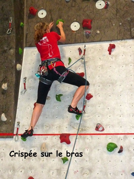 Lorsque l’on fait fonctionner des muscles il y a production de ce fameux acide lactique qui vient engorger les cellules et c’est là qu’apparaît douleur, crampes et courbatures. Les muscles des avant-bras commandent les doigts et nous sentons rapidement ces muscles ne plus vouloir répondre aux ordres impérieux que nous leur intimons d’agripper la prise suivante… Première constatation, c’est quand même à force de grimper, et donc de s’entraîner, que l’on repousse ses limites d’engorgement. Deuxième constatation, les étirements sont une des clés d’une rapide récupération: n’hésitez pas au pied des voies à étirer vos doigts et avant-bras en prenant appui sur la structure par exemple. Troisième constatation, le débutant a la fâcheuse tendance de serrer toutes les prises, même les bacs, comme s’il grimpait en solo , gardez donc à l’esprit que certaines prises peuvent être tenues en « doigt mort » c’est à dire sans être crispé ou verrouillé dessus.